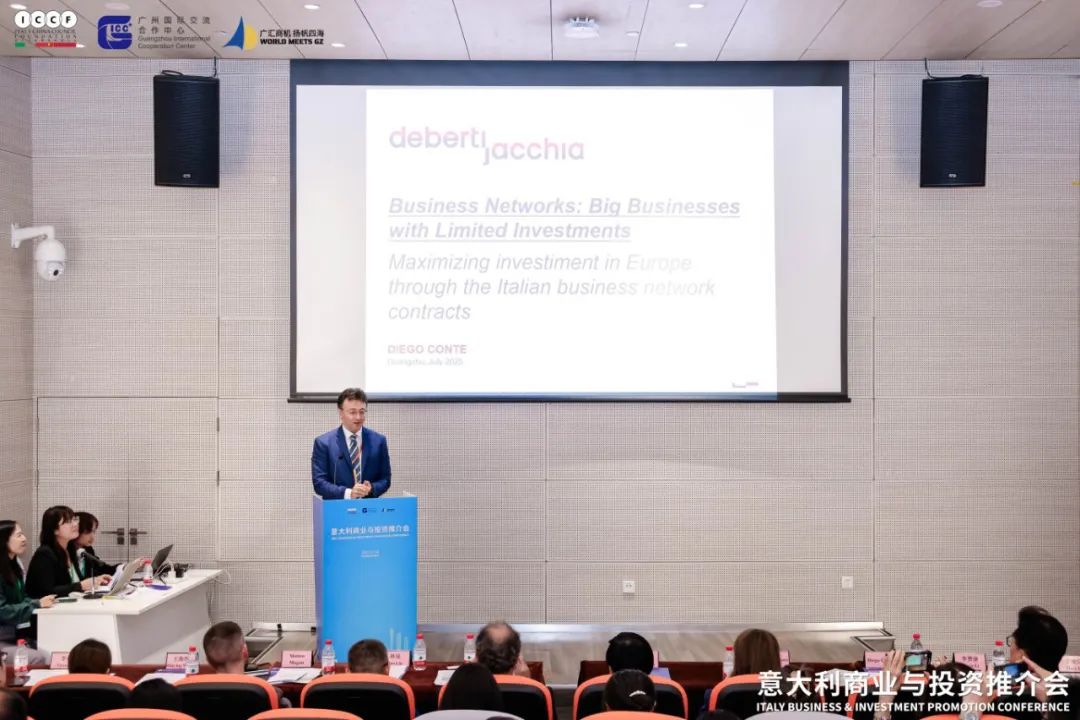 米兰德贝尔蒂・雅基亚律师事务所迭戈・孔蒂详细介绍了意大利“商业网络合同”模式。该模式能帮助中企以有限投资克服在意拓展业务的相关挑战,通过企业间灵活协作,使中企可作为主导方协调网络,规避重资产投入,高效利用本土资源与技术,并享受财税优惠及知识产权保护。