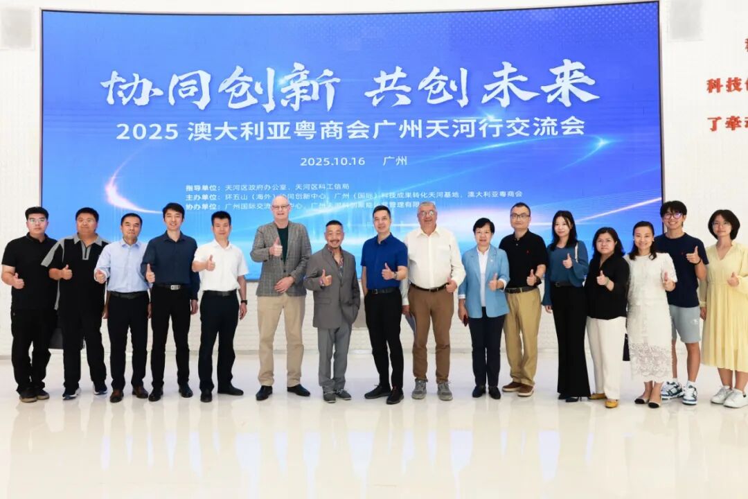 2025年10月16日,“协同创新,共创未来——2025澳大利亚粤商会广州天河行交流会”在广州成功举办。本次活动在天河区人民政府办公室、天河区科技工业和信息化局指导下,由环五山(海外)协同创新中心、广州(国际)科技成果转化天河基地、澳大利亚粤商会联合主办,广州国际交流合作中心(以下简称“广州国合中心”)与广州天河科创聚能运营管理有限公司共同协办。